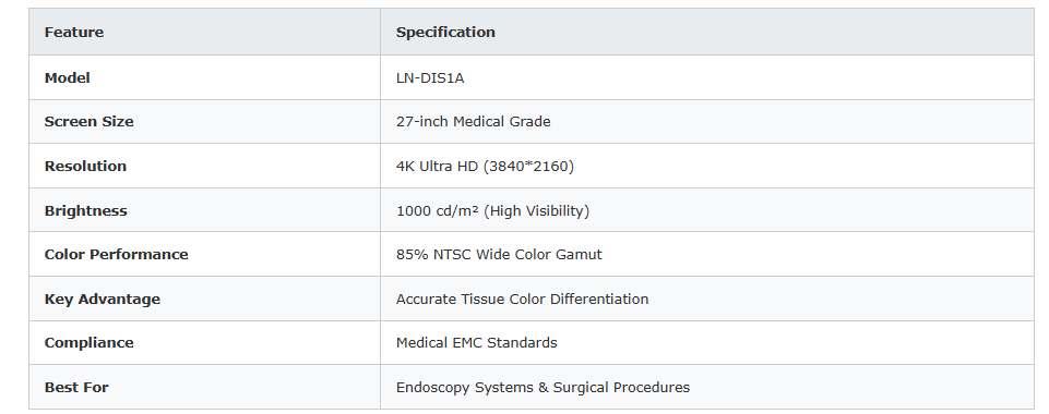 The LN-DIS1A 27-inch Medical Grade Monitor represents the pinnacle of surgical visualization technology, specifically engineered for demanding endoscopic procedures. This cutting-edge display delivers stunning 4K Ultra HD resolution with exceptional brightness levels of 1000 cd/m², ensuring perfect visibility even in brightly lit operating rooms. Featuring an extensive 85% NTSC color gamut, the monitor accurately reproduces subtle tissue color variations, enabling surgeons to clearly distinguish between mucosa, blood vessels, and bleeding points. Built to meet rigorous medical EMC standards, it provides unwavering stability and reliability during critical surgical interventions.