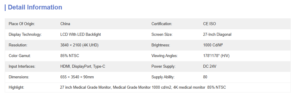 27 Inch Medical Grade Monitor 1000 Cd/M2 4K Medical Monitor 85% NTSC LN-DIS1A