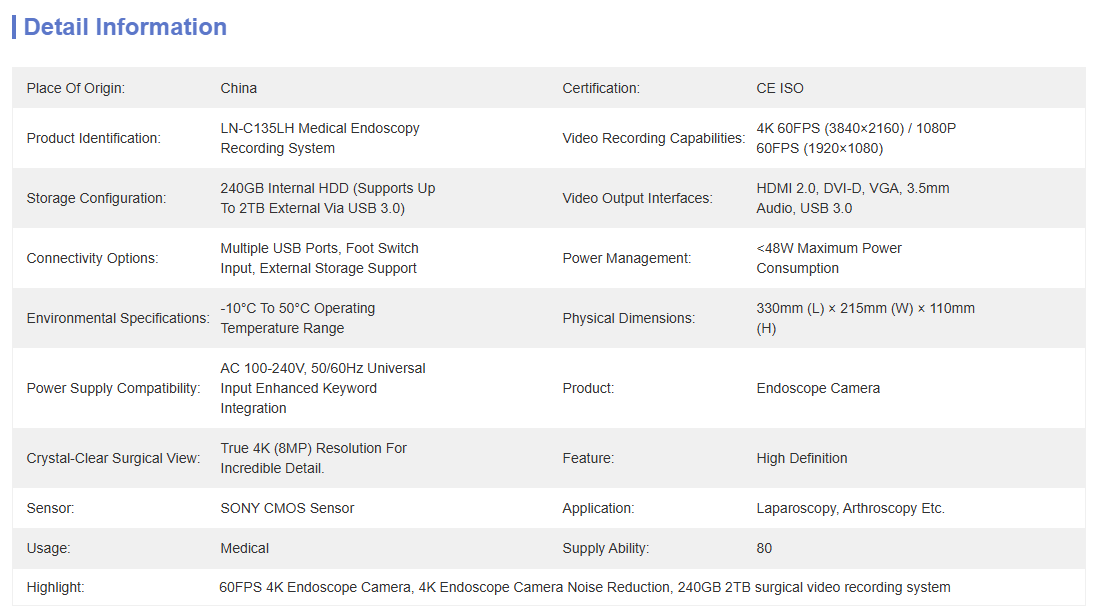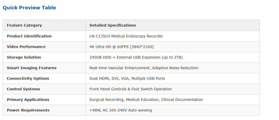The LN-C135LH represents the pinnacle of medical imaging technology - a state-of-the-art 4K endoscopy recording system engineered to capture every critical surgical moment with unprecedented clarity. This cutting-edge recorder delivers breathtaking 4K resolution at 60 frames per second, ensuring buttery-smooth, ultra-detailed documentation of even the most complex endoscopic procedures. Featuring our proprietary intelligent vascular enhancement technology and sophisticated noise reduction algorithms, the system provides surgeons with enhanced visualization capabilities while maintaining comprehensive procedural documentation. With its robust built-in 240GB storage and extensive expandable USB connectivity, it offers unwavering reliability for the most demanding clinical environments across numerous medical specialties.