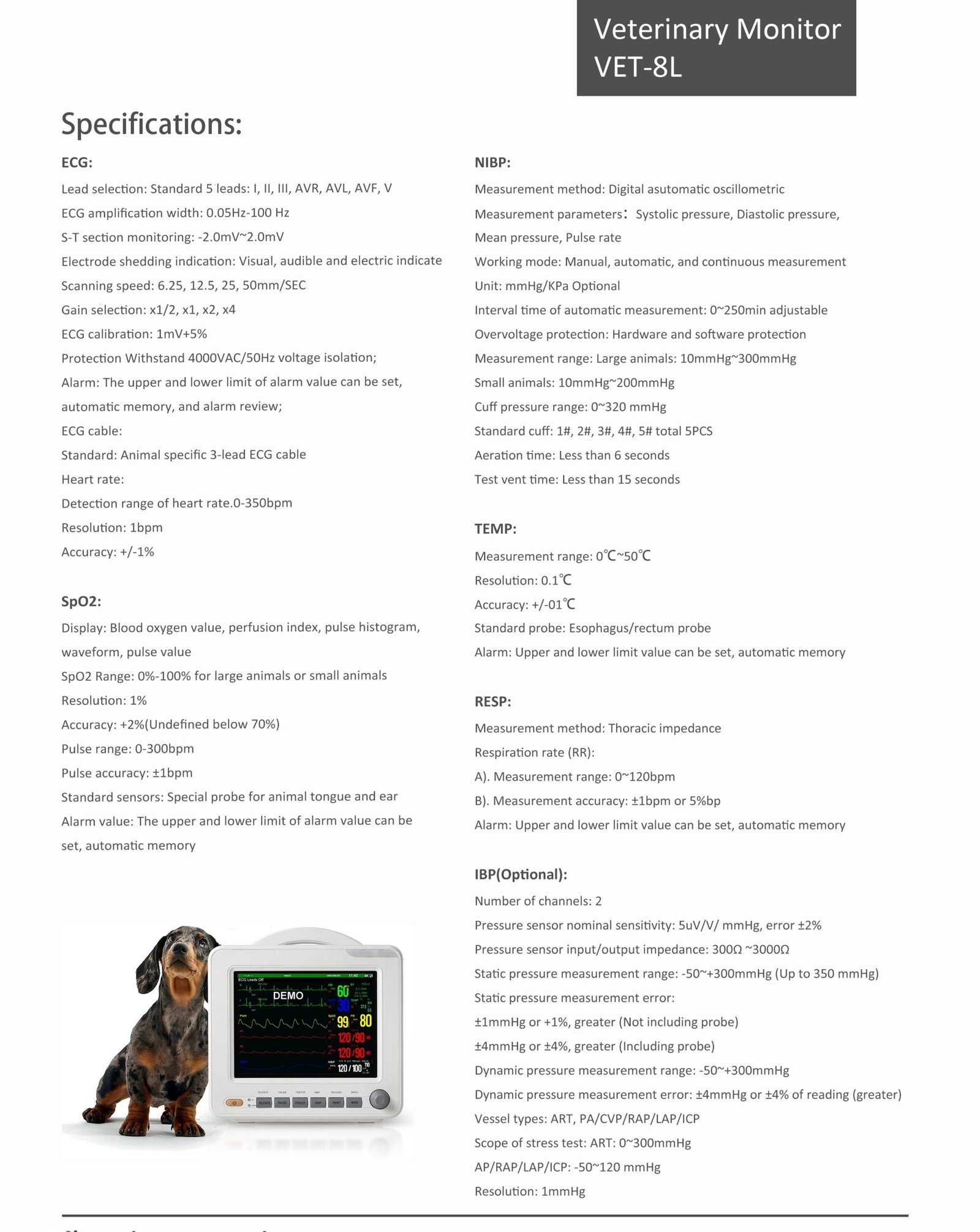 It has detailed specs: ECG covers 5 leads and various rates, SpO2 suits large/small animals