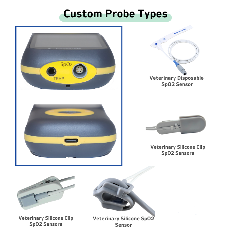 It supports diverse customizations. You can tailor the color box with your LOGO, pick optional adapters, charging docks, and probe types (like veterinary finger clip, silicone wrap probes), meeting unique clinic or business needs.