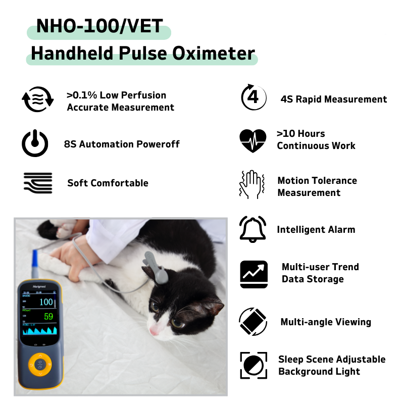 The NHO – 100/VET handheld pulse oximeter offers continuous and reliable monitoring.