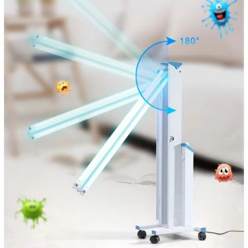 For hospitals, schools etc., disinfects surfaces/air quickly, usable with single tube, auto-shutoff after timing, ensure no leakage.
