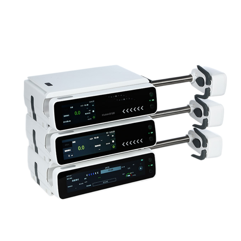 This medical automatic IV infusion syringe pump adopts detachable portable handle and stackable space-saving design. It supports cascade uninterrupted clinical infusion, IP34 leak-proof protection, automated plunger for quick syringe loading & precise positioning, real-time syringe remaining volume tracking, smart occlusion detection and automatic pressure release. Built-in drug library, auto syringe capacity recognition and wide syringe compatibility.