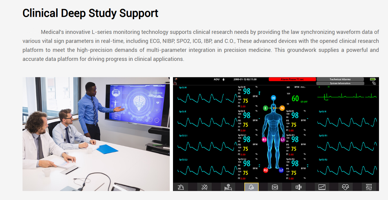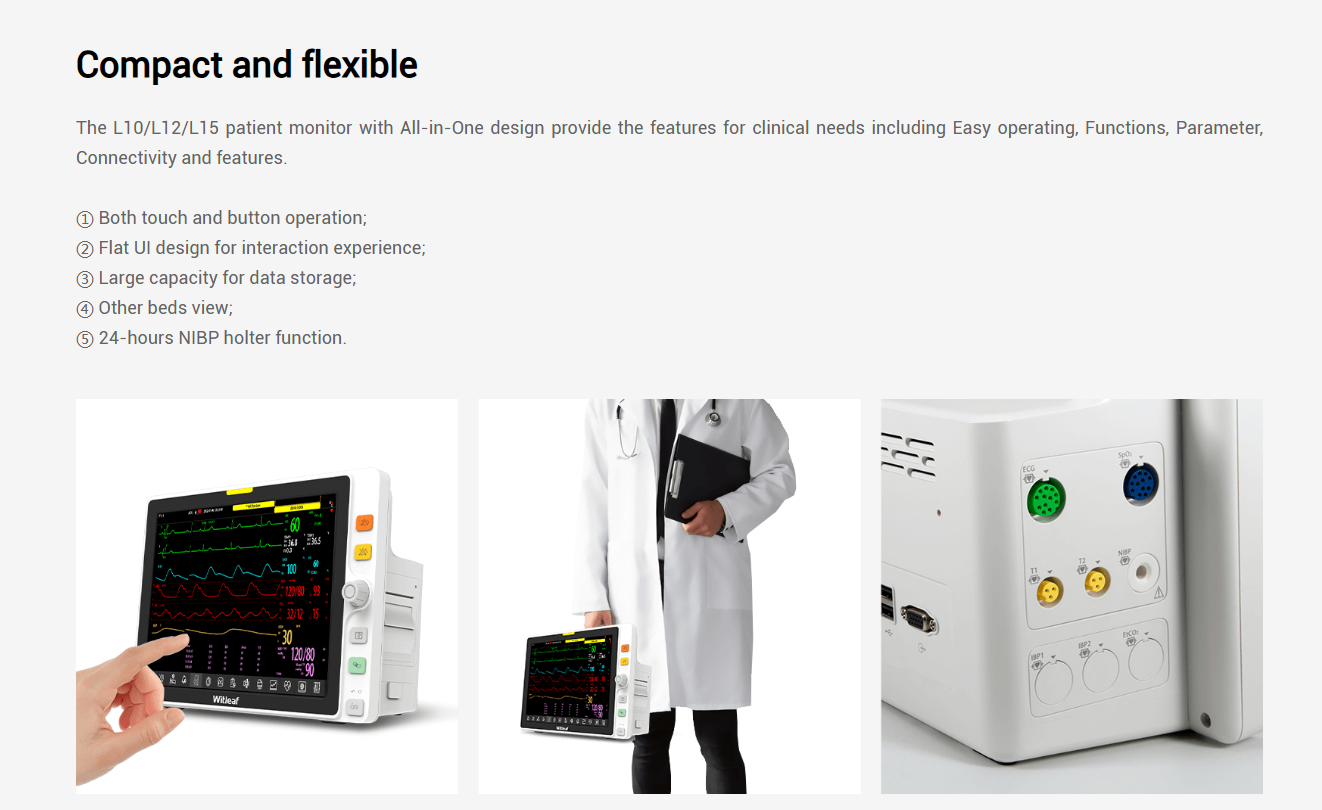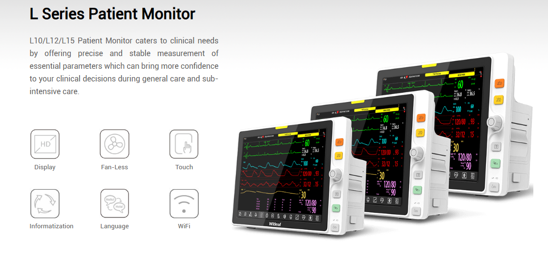 WL10/L12/L15 Patient Monitor caters to clinical needs by offering precise and stable measurement of essential parameters which can bring more confidence to your clinical decisions during general care an d subintensive care.