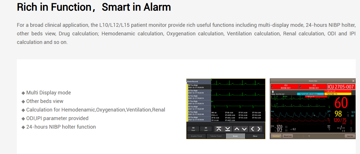 For a broad clinical application, the L10/L12/L15 patient monitor provide rich useful functions includin g multi-display mode, 24-hours NIBP holter, other beds view, Drug calculation,
